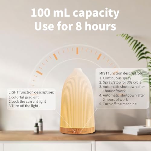 - 【Multi-Room Humidifier】This essential oil diffuser also works as a mini humidifier to helps alleviate dry air in the home. You can set the aromatherapy diffuser to intermittent mist (6-8hrs working time) that diffuser mists and pauses every 30s, it goes for almost the whole night. Or set it to continuous mist (3-4hrs working time) that keeps misting until water runs out.