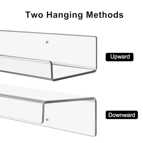 - 2 WAYS TO INSTALL: This clear book shelves can be used upward or downward. It comes with all necessary mounting hardware, including screws, wall anchors, and non-marking glue. You can install it with screws after drilling (rough wall surface), or directly install it with non-marking glue (smooth wall surface)