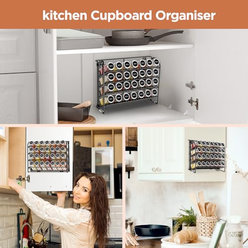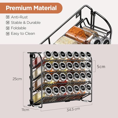 - 4 Tier Large Capacity Spice Rack: The spice rack measures 34.5cm L x 11cm W x 25cm H (spice jars not included) with a 5 cm gap between each tier. Holds at least 28 4oz spice jars for all your cooking needs. Fitting into most cabinets, this large capacity spice rack will keep your spices neatly organised and within easy reach.