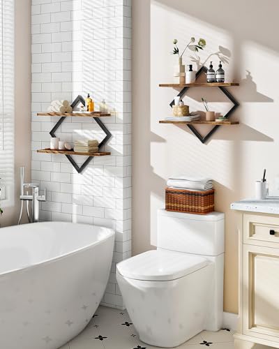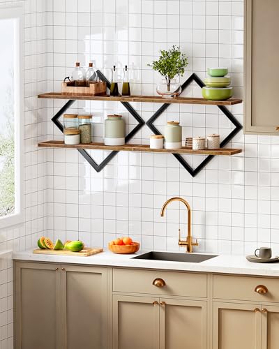 - Chic Diamond Design, A New Space Vibe: This 2-piece floating shelves set, with its diamond-shaped iron tubes and double-tier design, offers a fresh visual delight for your home space. Its vintage industrial hue effortlessly complements your indoor decor