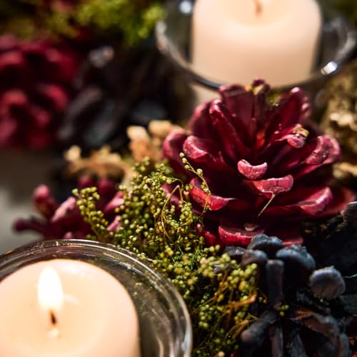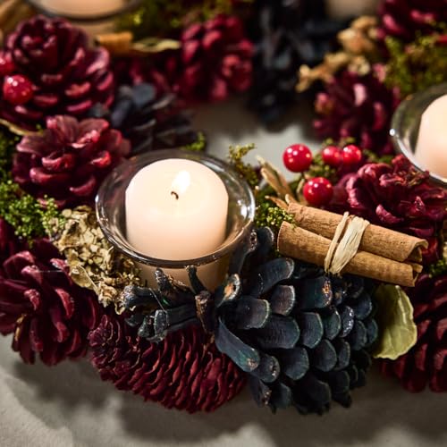 - Made from natural pine cones with a red and green dyed finish adorned with cinnamon sticks and artificial berries