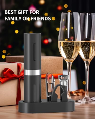 - Elegant Design – The set boasts a classic, luxurious black appearance complemented by an elegant charging station, which not only facilitates storage but also ensures that the electric bottle opener remains fully charged at all times. Additionally, the built-in blue LED lights automatically illuminate while working.