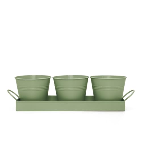 - Sage Green Colour – Included: 3 x Metal plant pots. 1 x Metal drip tray – Pot Size: 4.5" (11.5cm) diameter x 4" tall (10cm) – Tray Size: (not including handles): 32cm wide x 3cm tall -Tray Size: (including handles): 39cm wide x 5cm tall – Pot Capacity: 600ml / 0.6ltr. – Material: Matt powder-coated metal – The metal plant pots are ribbed for style and rigidity – Also available in 3 Colours: White, White Chalk and Charcoal Grey.
