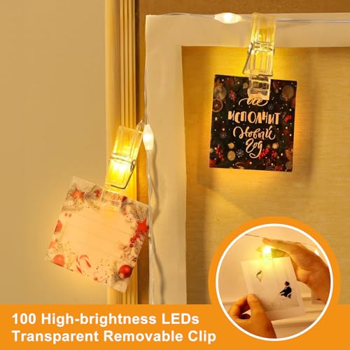 - 【100 LED & 50Clips 】Display Multiple Pictures and Artworks: Our photo pegs lights feature 100LED lights, each 10cm long, totaling 10 meters. Equipped with 50 transparent clips, you can showcase your favorite pictures, xmas cards, prints, kid's artworks, and more.