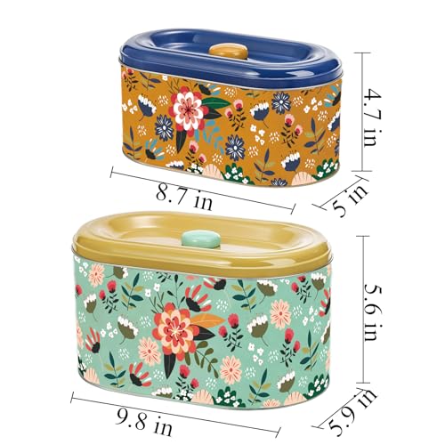 - Coloch tin cookie snack jar set comes in 2 sizes: the small one measures 8.7x5x4.7 inches; the large one measures 9.8×5.9×5.6 inches. Its compact size allows for easy storage on countertops, shelves, or in cabinets, making it a space-efficient choice for those with limited kitchen space.
