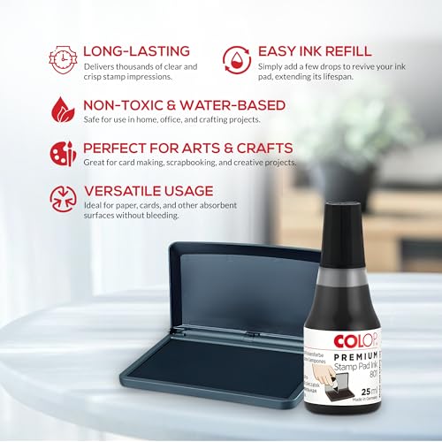 - COLOP Stamp Ink Refill – refresh your foam and felt rubber stamp pads with this water-based, non-toxic refill. Simply add a few drops and watch your black ink pad come back to life