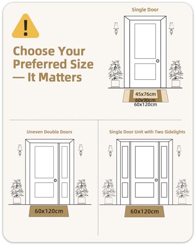 - PRACTICAL & LOW-PROFILE: The floor door mat is not too thick to obstruct doors, the rubber backed door mat make it more convenient and practical to use in daily; this outdoor mat provides 3 sizes to choose: 45x75cm/60x90cm/60x120cm; for a harmonious looking, we recommend that the durable and heavy duty door mat should be no smaller than 80% of the width of your front door