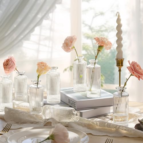 - [DIY Use]: Bud vases are perfect for decorating dining tables, living rooms, bedrooms, kitchens, and bathrooms. Get creative by using them as candle holders or aromatherapy diffusers, or tied them with hemp rope to hang on the balcony for a unique touch