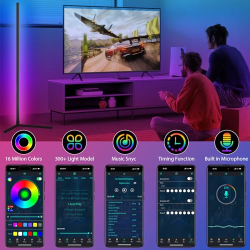 - 【Bright Charming Light Show】: Led corner floor lamp with 16 million color options and 300+ dynamic lighting modes, You can customize yours to suit your mood, occasion, or event light mode. Color changing floor lamps can achieve beautiful color combinations and smooth dynamic multi-color effects to create the ideal atmosphere. The effects furnish a great light show in your home. Impress guests during game nights or party events, and create a cozy ambiance for reading or watching movies.