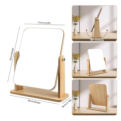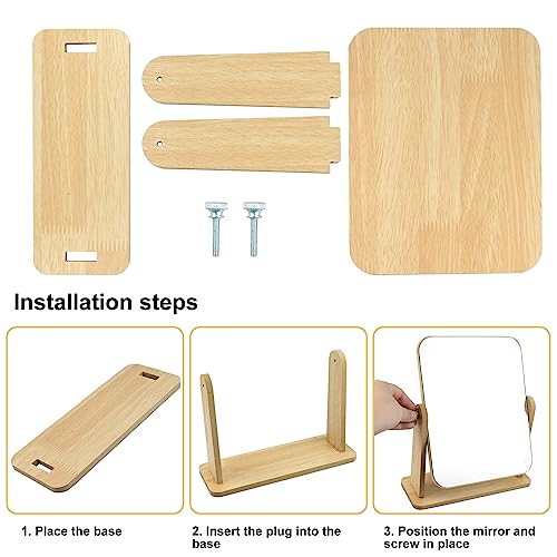 - 360 ADJUSTABLE The bracket can be rotated 360 degrees and can be adjusted to tight fit with screws, so that the table mirror is always in the best position and suitable for makeup at any angle. The wooden supports ensure that the mirror is evenly balanced and can be used safely.