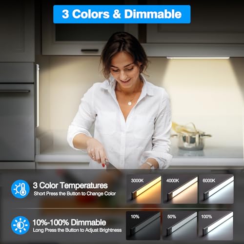 - 【3000K/4500K/6000K CTT & Dimming】With 78 lamp beads (39 warm LEDs+ 39 cold LEDs), the cabinet light offer three color temperature and 10-100% brightness for choice: Warm Light (3000K) best as a night light, Natural Light (4500K) for reading, White Light (6500K) for cooking, short press to switch color, long press to adjust brightness.