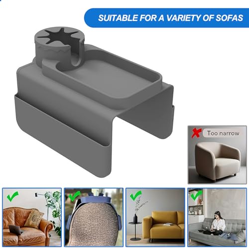 [- 【All-in-one Practical Storage]】 This sofa arm tray features a seamless design, ready to use straight out of the box with no assembly required. It cleverly organizes various items, with a raised cup holder made of thickened elastic material to accommodate different cup sizes while preventing spills. The additional compartments securely hold smartphones, books, and snacks, keeping everything tidy.