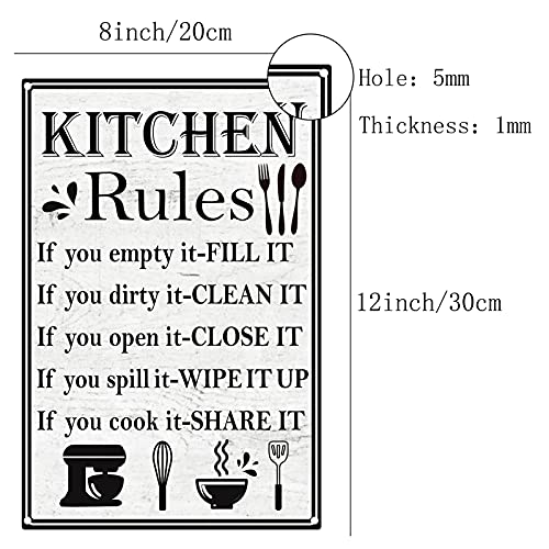 - TIN SIGN SIZE: 1pc x kitchen rules metal tin sign, size: 12 x 8 inch (30 x 20cm). Thickness: 0.1cm. Hole diameter: 0.6cm. Good decoration for home, bar, coffee shops, stores, restaurants etc