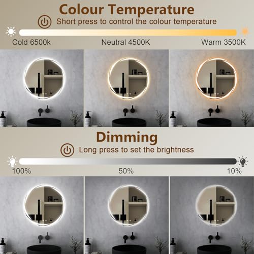 - 3 Light Colors and Dimmable: This led bathroom mirror have 3 light colors to choose from: warm white, neutral white, cool white, creating a warm or bright atmosphere, the brightness can be adjusted between 10% and 100%
