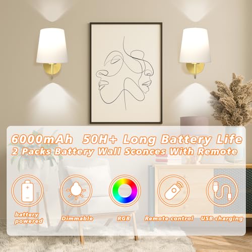 - 【 Adjustable Color Temperature and Brightness 】Wireless battery-powered wall lamp set comes with USB charger cable and 2 LED bulbs that offer 7 RGB colours changable, 3 levels of temperature: warm white (3000K), neutral white (4500K), and cool white (6000K) and 4 levels of brightness from 25%~100%, Lasts 25-50 hours on a single charge. 2 control methods: Push button switch and remote control.