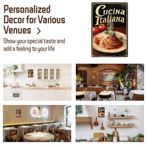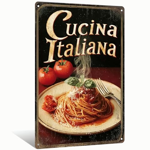 - Showcases Classic Italian Flavor: Features the phrase “Cucina Italiana” alongside a delicious plate of pasta, garnished with basil and tomatoes—capturing the charm and culinary richness of Italian culture in a vintage-inspired style.