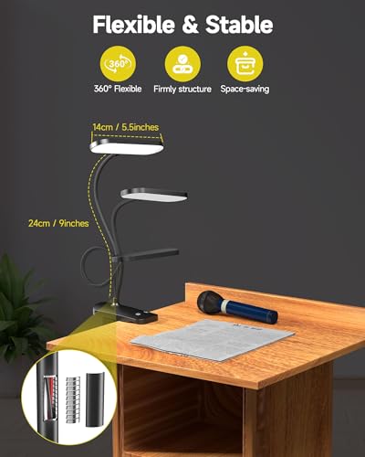 - Flexible Gooseneck & Wide Clamp Lamp – The table lamp boasts a sturdy large clip with silicone pad, securely gripping surfaces up to 2.4 inches thick and keep them scratch-free. Easily attach it to headboards, desks, shelves, end tables or music stands. The clip's curved inner shape fits perfectly on metal bed frames. Its 360° adjustable swing arm can bend and twists to your desired position, giving you plenty of light