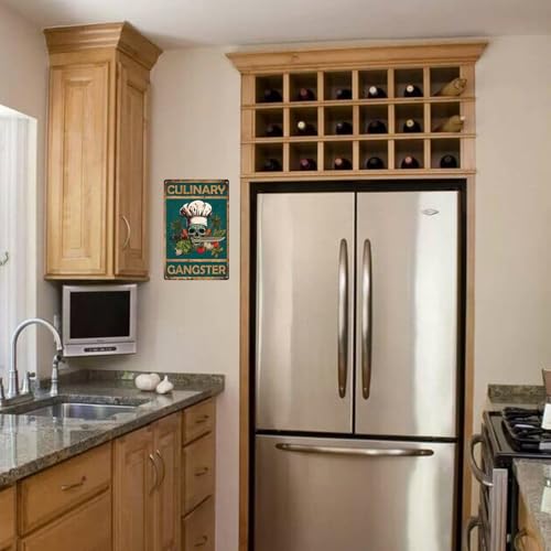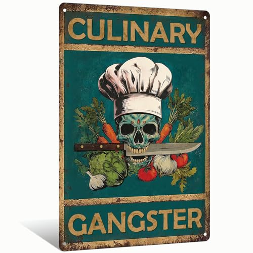 - Bold & Playful Kitchen Sign: Features the fierce phrase “CULINARY GANGSTER” with a skull in a chef hat holding a knife—perfect for chefs who cook with attitude.