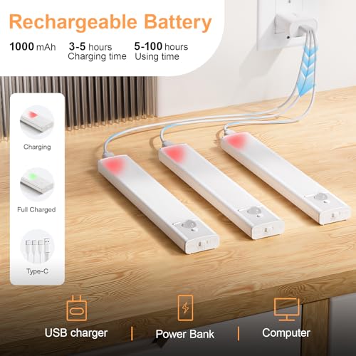 - 【Rechargeable Battery】: Equipped with a 1000mAh battery, these rechargeable under cabinet lights last up to 5 hours in always-on mode and 7-30 days in motion sensor mode. No frequent recharging needed. You can full charged the under-cabinet lights in 3-5 hour via 3 in 1 type-C cable.