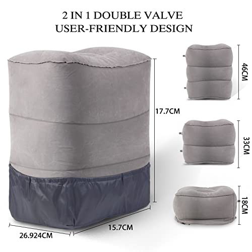 - Very User-Friendly Design: Our inflatable foot rest pillow with 2-in-1 double valve,the upper black air valve is a one-way air inlet for inflating or replenishing gas.bottom transparent air valve can be quickly inflated and deflated,when you are done blowing it up, push clear cover on and push whole valve in so that it is flush with the side of the travel foot pillow,the airplane footrest takes away the hassle of bringing a pump and making noise in flight.