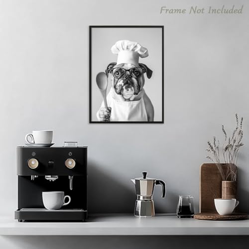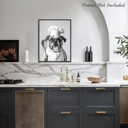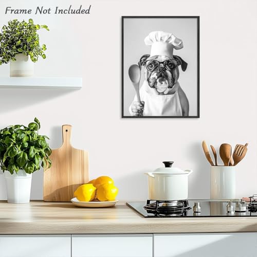 - Unique Design: This black-and-white poster showcases a whimsical dog dressed as a chef, rendered in bold, graphic lines. The playful design merges humor with sophistication, creating a striking visual contrast that elevates kitchen or dining areas with a touch of quirky personality.