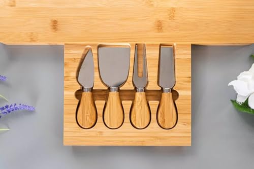 - Knife Drawer – The clever design of this cheese board will "impress." your guests while enjoying the cheese. Hidden in the cheese board, there is a sliding drawer that will keep the 4 knives supplied safely. The 4 knives included are a Stilton knife, a cheddar knife, a soft cheese knife, a hard cheese knife, and a cheese fork.