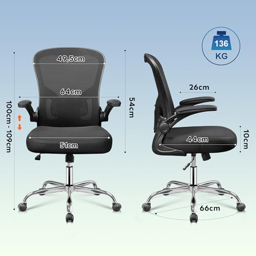 - 90° Flip Armrests: This desk chair adopts 90° flip armrests, the top of the armrests are covered with soft foam cushion, which can provide support for your elbows and shoulders, and the armrests of the office chair can be flipped and pushed under the table when it is not in use, so as to save the space.