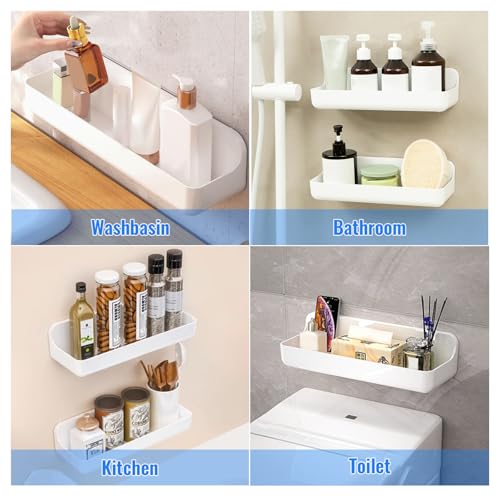 - 【Space Saving Self Adhesive Bathroom Shelf】 This adhesive shower caddy is perfect for keeping your space clean and tidy. Use the self adhesive shower shelves in the shower cubicle to store shampoo, conditioner and shower gel, in the kitchen to organise oil bottles and spice jars, in the sink area for cosmetics and skincare products, in the bedroom for stationery and scented candles, and in other areas like the living room, closet doors, study, and office.