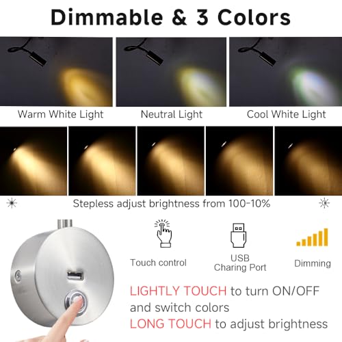 - 【DIMMABLE & 3 COLOR】 – 3000K warm white /4000K neutral light/ 6000K white light can be switched. LONG press to adjust brightness, LIGHTLY touch to switch between 3 colors and turn on/off. The multi-purpose lights can be used for bedside lamp, desk light, wall mounted lamp, reading light, night lamp etc.