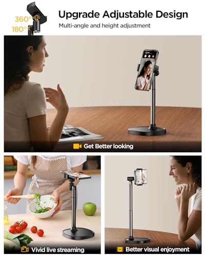 - THE BEST ANGLE ADJUSTMENT, 180° FLIP AND 360° ROTATION: This new version of the cell phone stand desktop supports 180° rollover and 360° rotation. You can have more comfortable angles, Like watching, reading, studying, playing, video calling or meeting. If you are a video blogger, the adjustable cell phone holder stand can provide a better phone support angle for your live.