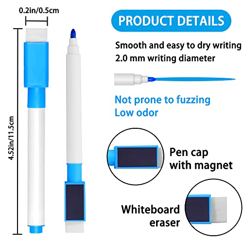 - Clever Design: Each whiteboard markers cap comes with a whiteboard eraser, which can easily wipe the content written on a smooth surface. Additionally, one side of the cap has a magnet, which can adsorb the pen to the refrigerator, whiteboard, and other places, reducing storage space and making it easy to use without losing the cap.