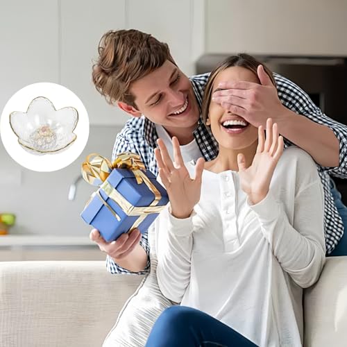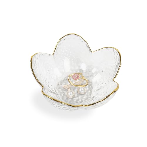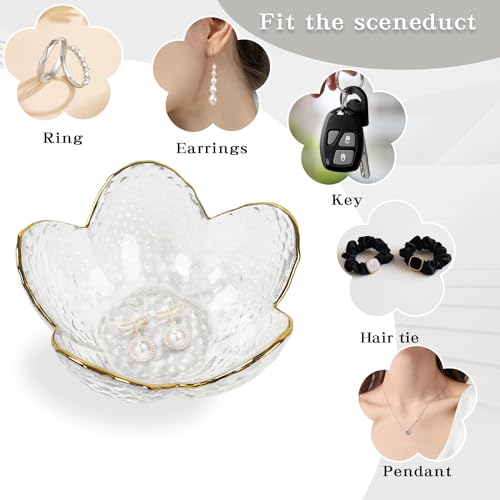- Stylish & Functional: Crafted from premium clear glass, this elegant trinket dish combines beauty with practicality. the transparent design allows your jewelry and ring to be within reach.this space-saving jewelry tray fits perfectly on vanities, nightstands, or bathroom counters. The crystal-clear glass and gold-trimmed floral pattern add a touch of chic decor to any room while keeping your small accessories organized. An ideal blend of form and function for modern living spaces