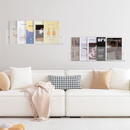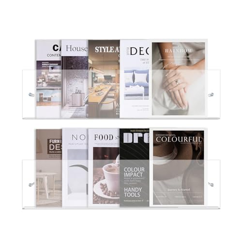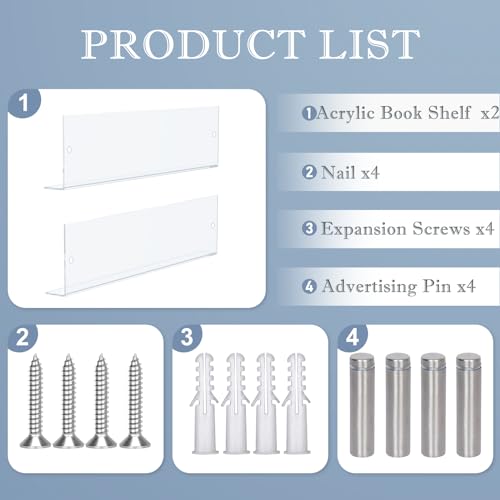 - CLear and visible:Our acrylic floating shelves come with mounting screws and anchors and instructions manual. Just follow the instructions,it will be very easy for you to put shelves on wall.The acrylic floating bookshelf looks clear and simple, hangs cleanly on the wall and makes the room look neat and tidy. Kids can easily see the book's cover and get their favorite books.