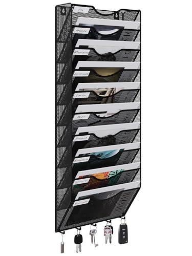- Space Saving: Wall file holder can be mounted on the wall, freeing up desktop space while organizing folders, clipboards, bills, invoices, papers, letters, etc. There are 5 hooks at the bottom, suitable for keys, tools, umbrellas and small items