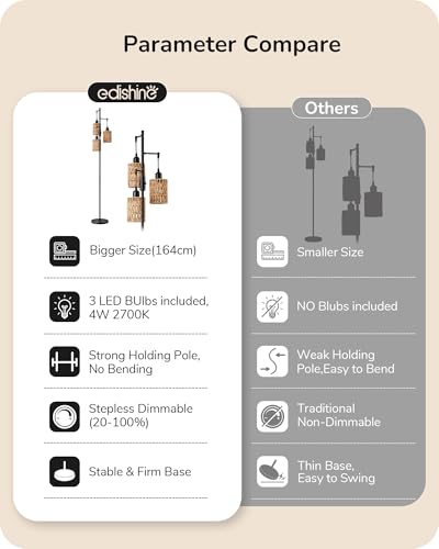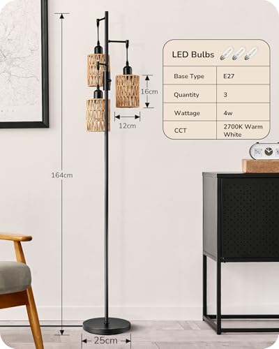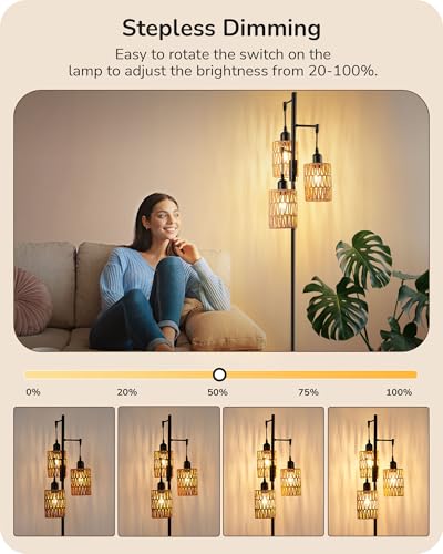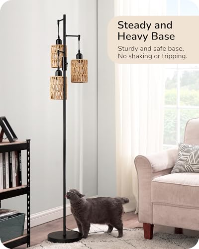 - [Boho Rattan Tall Lamp] The farmhouse LED floor lamp features 3 light heads, all crafted from handwoven soft rattan; elegant and minimalist black metal structure design superbly complements industrial, vintage, mid-century, and rustic styles, adding a decorative touch to your room