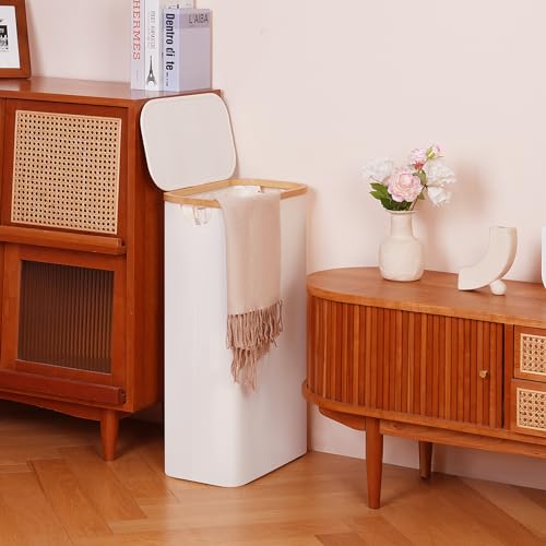 - [Well made sturdiness & durability]: Made of Linen & Bamboo, healthy and odorless material. This Thin Skinny laundry basket can be used for a long time, up to 2 years or even longer. We provide the best after-sales service: 30 days no-hassle exchange and return.