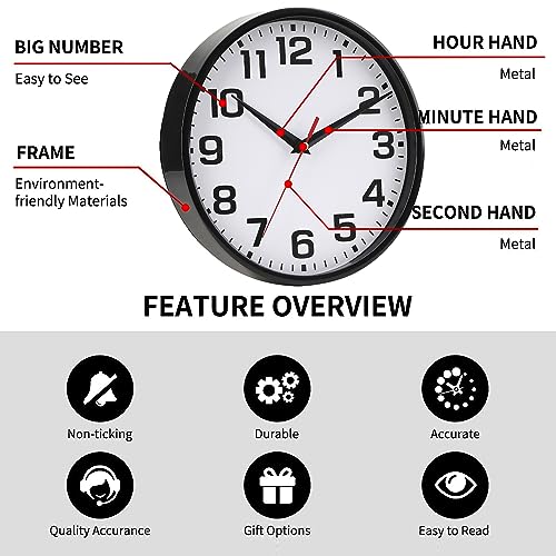 - High Quality Wall Clock – The newest black wall clock frame environmental engineering plastic, non-toxic and safer; metal pointer is used and copper sleeve is added for reinforcement, which is more closely combined with the movement.