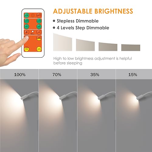 - 【Convenient Remote Control】The wall mount bedside lamp experiences seamless brightness control with the functional remote, featuring strong signal connectivity. Adjust the light smoothly or choose from four different brightness levels (100%-75%-35%-15%). The four-level timer function (10mins-20mins-1hr-2hrs) is ideal for night lighting before bedtime. (Please refer to the details page to follow the steps to pair the lamp and remote control first)