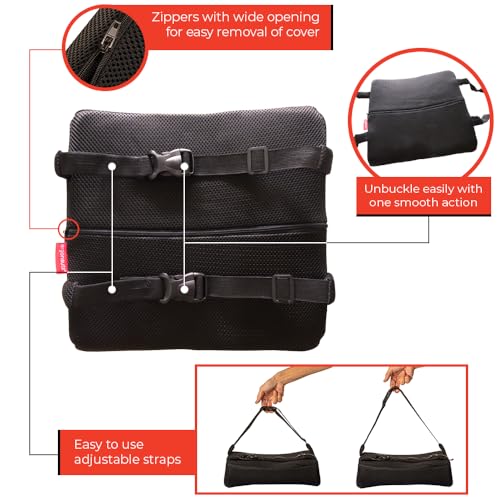 - DOUBLE ADJUSTABLE STRAPS FOR STABILITY: Our lumbar support cushion comes with two adjustable straps, instead of just one, to keep it securely in place and prevent it from sliding down. We’ve also included two extension straps, ensuring a perfect fit on any office chair, computer chair, armchair, sofa, couch, car seat, SUV, truck, wheelchair, recliner, and more.