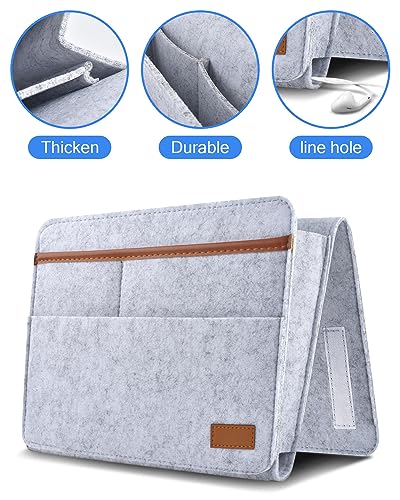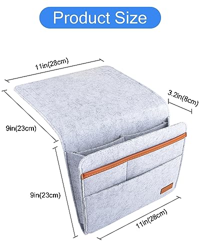 - Material and Size: This Bedside Organiser 99% polyester felt and 1% PU leather, the upgraded bedside organizer is thicker, more strong and durable. Its size is 12.6* 8.5* 3.9 inches. This bedside storage caddy has 1 large pocket, 5 small pockets, and it's light weight and portable