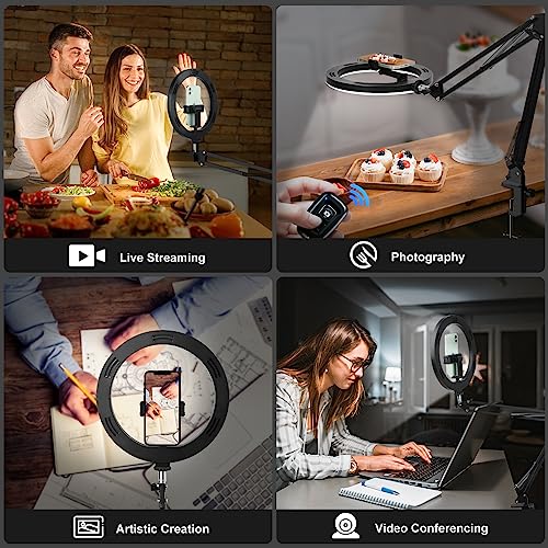 - 【Stable and No Shaking Halo Light】The ring light with stand overhead tripod for phone is made from durable alloy with an upgraded cantilever bracket for flexible angle adjustments. The metal desktop base securely holds the ring light to the table, saving space. Featuring upgraded double springs to prevent slipping.Unique design phone holder overhead light makes it no shadows during use