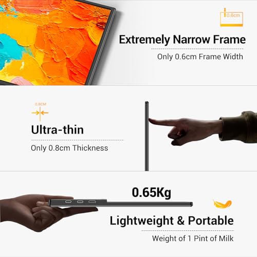 - Ultra-Slim & Travel-Ready : Weighing just 1.46 pounds, about as light as a medium-sized French baguette, this 15.6-inch monitor is incredibly portable. Its ultra-slim profile slides into your backpack or laptop bag effortlessly, making it the perfect on-the-go companion for work trips, mobile gaming, or remote presentations.