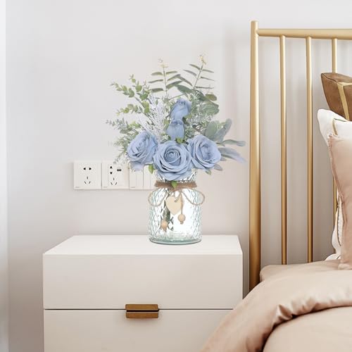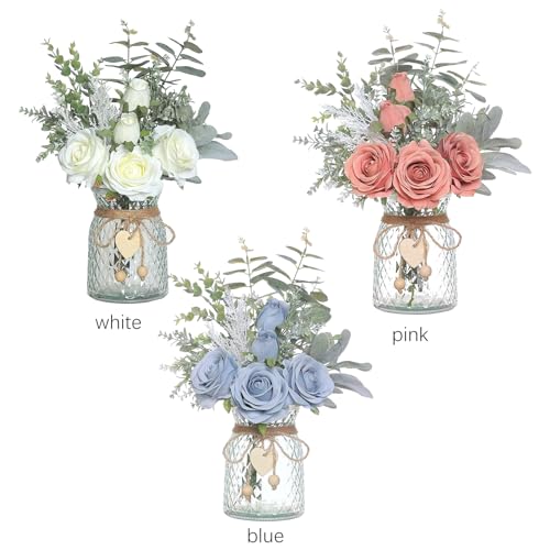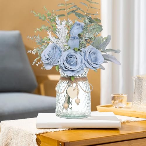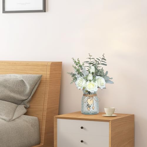 - Elegant Artificial Flower Arrangement: The set includes silk roses, artificial eucalyptus and a beautifully designed glass vase adorned with heart and globe pendants and twine.
