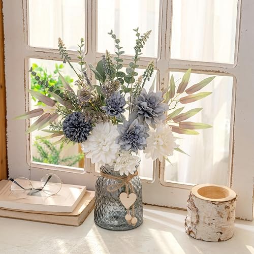 Fake Flowers with Vase, Blue Silk Dahlia Artificial Flowers Silk Flowers Arrangement in Vase Suitable for Home Spring Decor Office Decoration, Dining Coffee Table Centerpiece Kitchen Bathroom