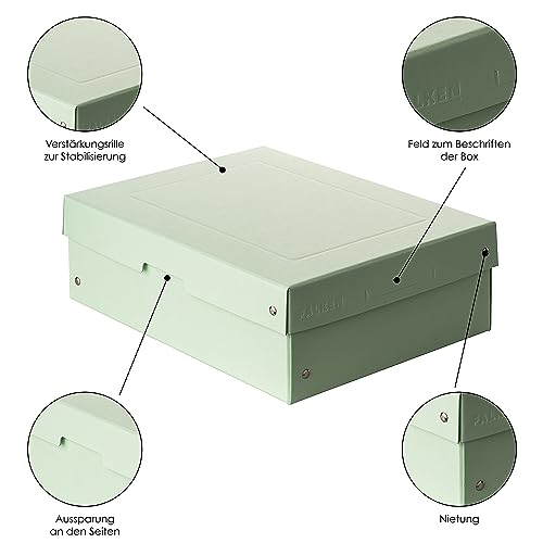 - Features: box with lid made of high-quality cardboard (bookbinding cardboard), riveted, with labelling field and handle recess