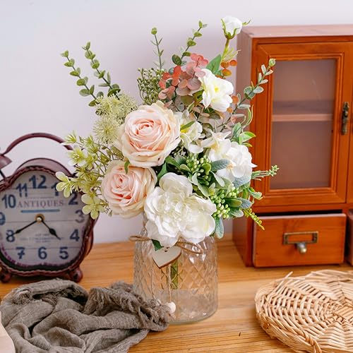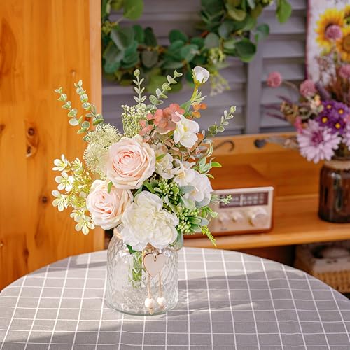- Elegant Floral Arrangement: This beautiful faux flower arrangement features a lovely combination of pristine white roses and soft peonies, creating a sophisticated and timeless look that enhances any decor. Perfect for adding a touch of elegance to any room in your home.