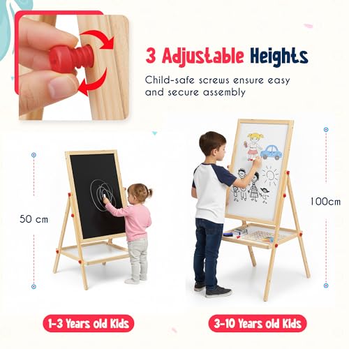 - ADJUSTABLE HEIGHT: This chalk board for kids is designed to grow as your child does and is available in multiple sizes. The height of the kids' easels can be easily adjusted, making them suitable for younger toddlers and older kids alike.