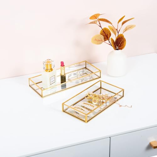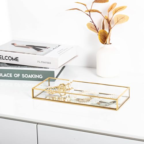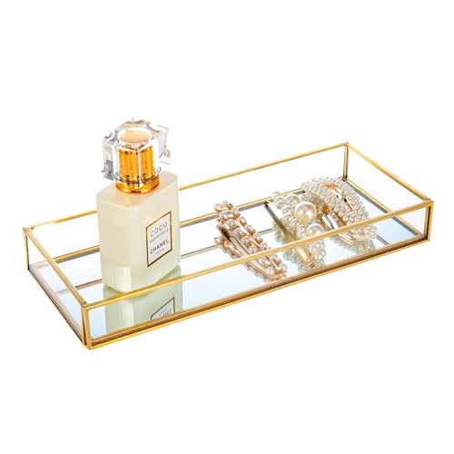 - CLEAR GLASS VANITY TRAY MATERIAL: Made of high quality clear glass with Golden edges . Anti-Scratch Glass Mirror with Protective Bottom. Sturdy and durable to hold or display.