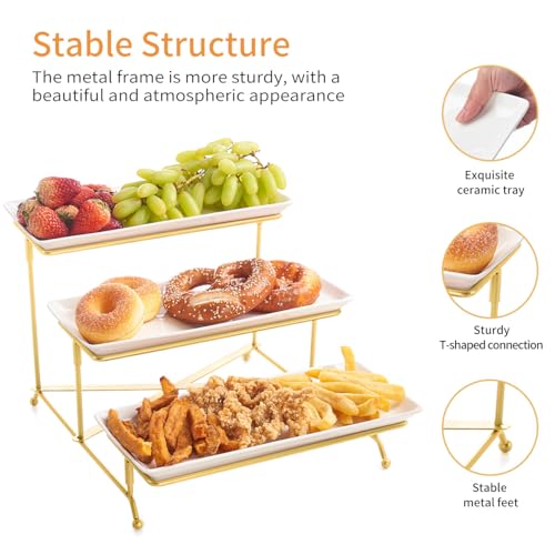 - 【Upgraded Stable Stand Design】: Fiita's 12/14-inch serving tray stand comes with 3 layer sturdy metal stand with three of white rectangular ceramics trays, providing ample space to elegantly present your food and desserts, The golden metal rack is robust, and stable,foldable, allowing to flexibly adjust angles and convenient access to food. Our tiered platter stands firm while holding your favorite delicacies. Whether it’s delicate pastries or savory bites, rest assured the serving stand will make your display secure and eye-catching