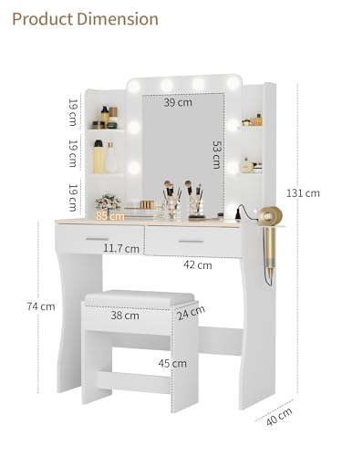 - VANITY DESK WITH SMART STORAGE: This dressing desk has 2 large drawers, 6 open shelfs, 1 hairdryer holder and a spacious tabletop that provide the ideal space to store and organise your cosmetics, perfumes, jewelry, other beauty supplies, and more in different places. And it comes with a cushioned stool. Creating an organised make-up environment.